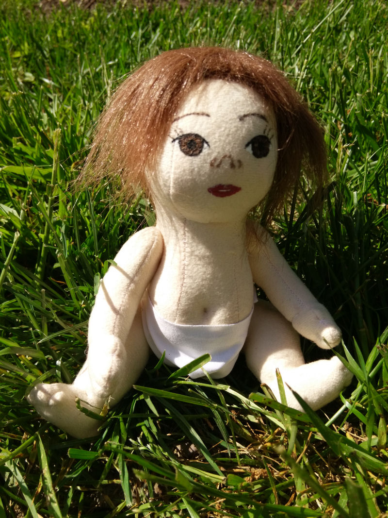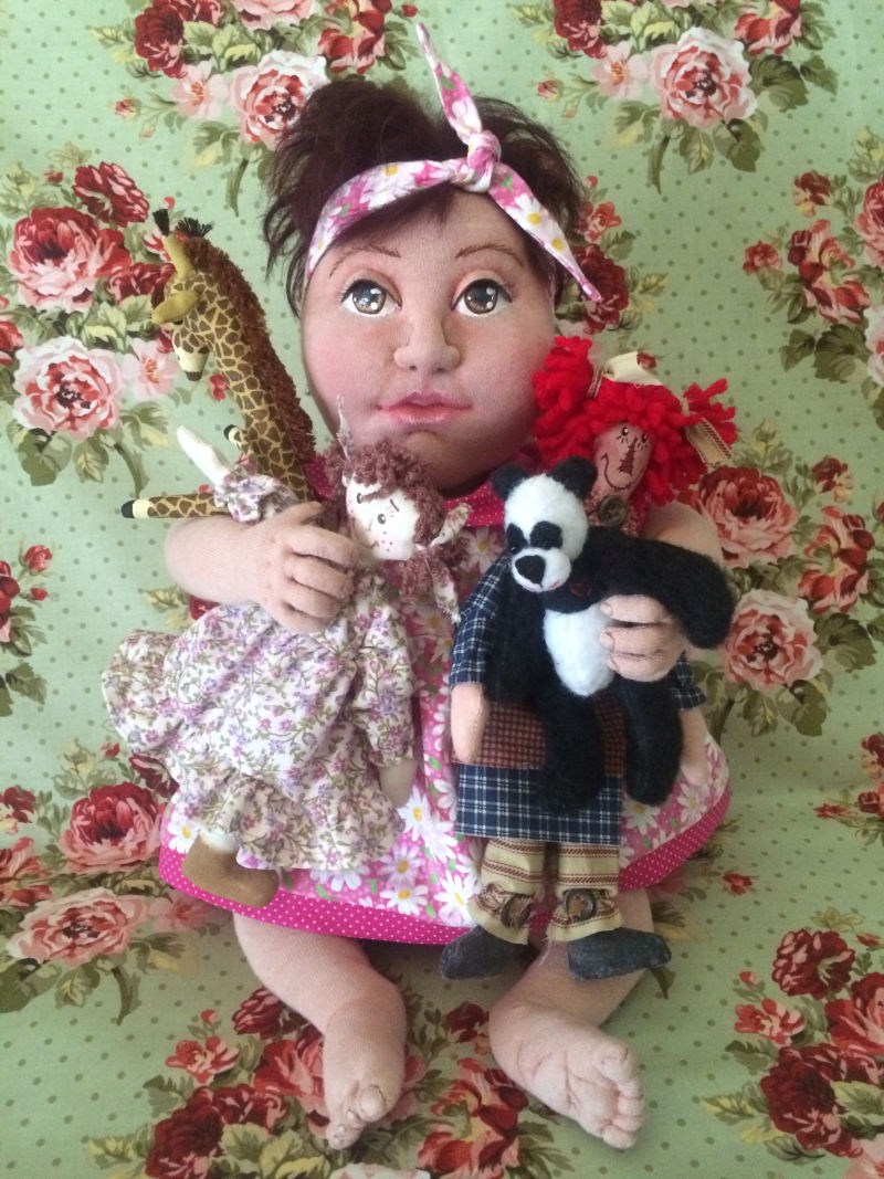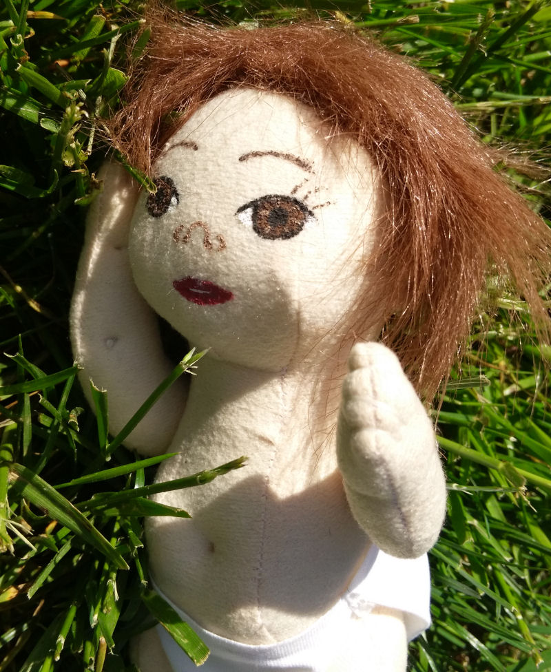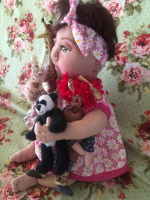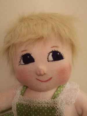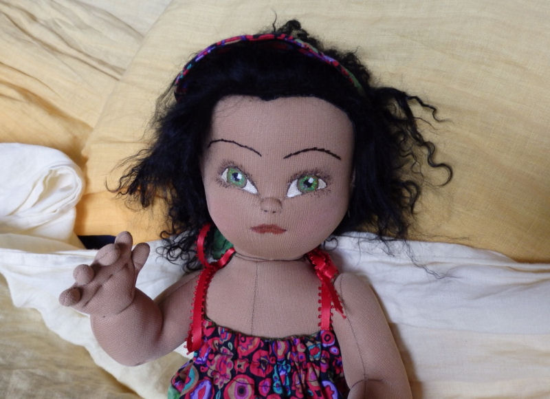 because she has plastic joints in her legs and also in her arms. She is made from polyester knit fabric and she has a lot of sculpted details. Her eyes and lips are painted with acrylic paints. Her eyelashes and eyebrows are embroidered. She has a purchased wig, which is sewn on her head by hand.