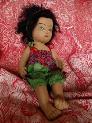 The pattern of this doll is from Darlene Rausch's Joy pattern.This little summer baby girl is 10 months old. She's in knit fabric and has 5 plastic joints. She's needdlesculpted and her fingers are wired. Her beautiful black hair is tibetan lambskin. The face is painted with acrylic paint and her eyebrows are embroidered. Her clothes have been made for her from a Nada ge Saladini's pattern.