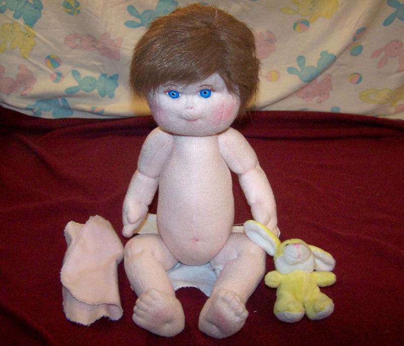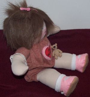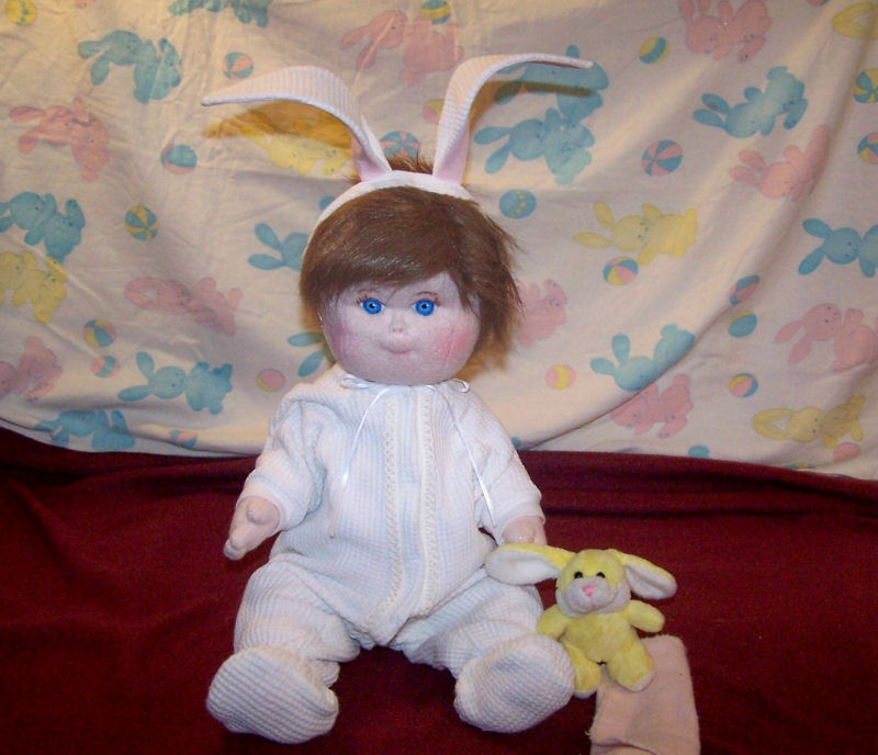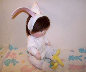 I made this doll from the pattern- Penny- designed by Marilyn Jensen(Springtime Designs). The doll is 4-way jointed and measures aprox. 16". I used velour fabric for the doll. I created my own fur wig to give the doll more hair, and made the sleeper from the pattern, using a recycled receiving blanket. The bunny ears/headband, I designed to match the sleeper. The diaper I made from a piece of flannel cut into a diaper shape with a serged zigzag stitch all around the edges. Velcro was added to keep it securely on the doll. Acrylic paints and fabric markers were used for the eyes. Blush was added to appropriate spots on the doll.