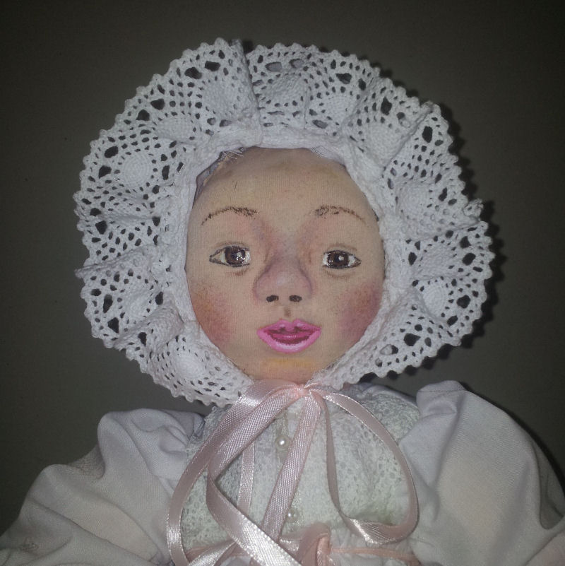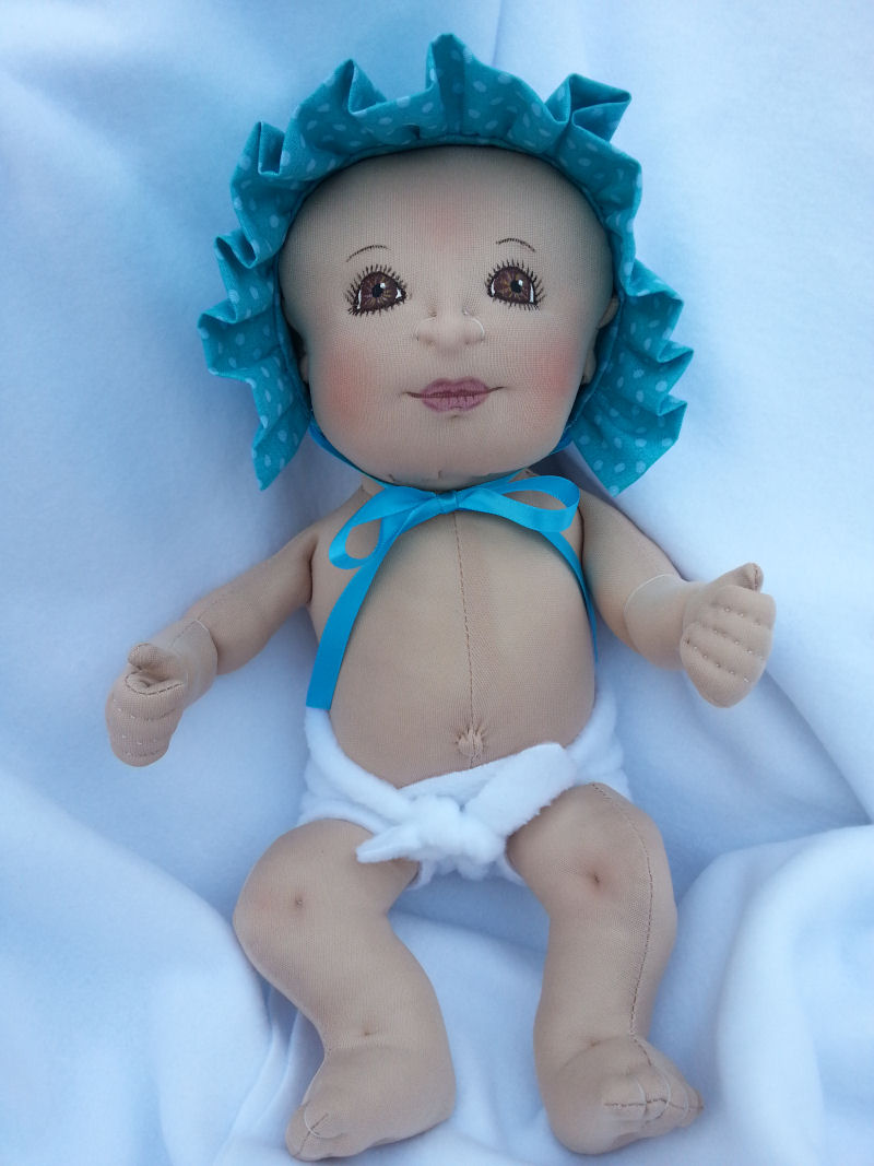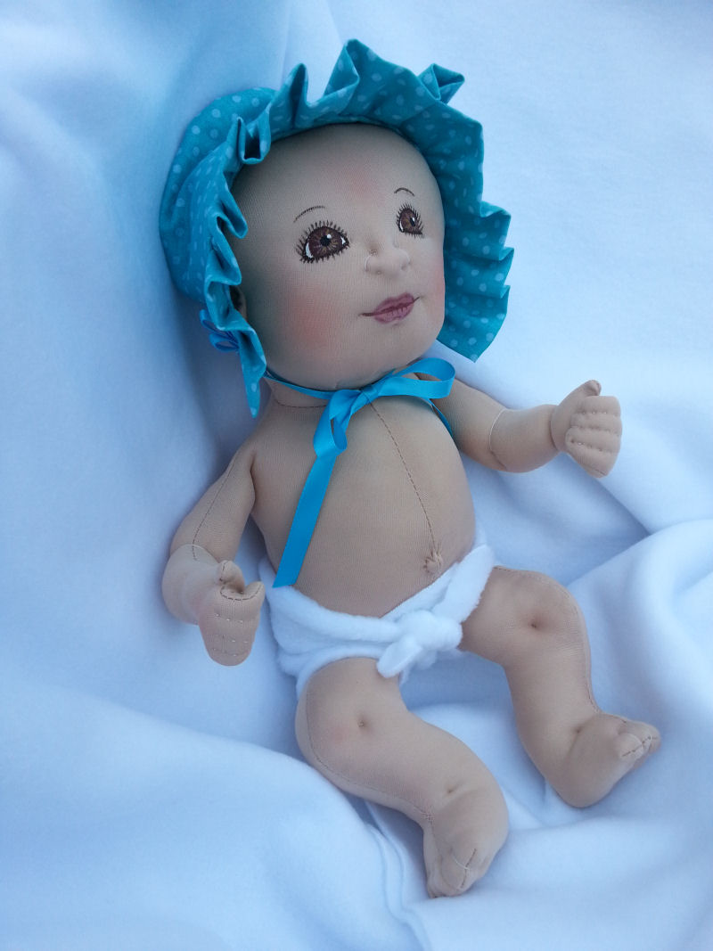 Jenny is 14" long. She is made from a stretch knit fabric and stuffed with premium polyester fiberfill. Her face is painted with non-toxic acrylic paints. She is hand sculpted and very soft. Jenny has no hair, but has a cute little bonnet made by me, and a fleece triangle diaper.