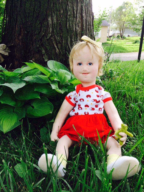 Abigail was made using Darlene Rausch's Bonnie pattern with a few modifications. She is wearing a onesie with ladybugs and red velvet bloomers, with yellow socks and white felt handmade shoes adorned with daisies.