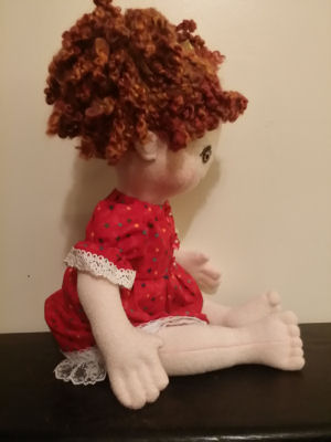 Julia is created from medium weight unbleached calico. Julia is 21" in height. She was created from scratch entirely by me. Julia is weighted with glass beads in her seat, hands and feet. Her clothes are shop sourced and as her body is small and her head big her clothes are much smaller then usual and more difficult to find. Julia looks like my neice with the same name.