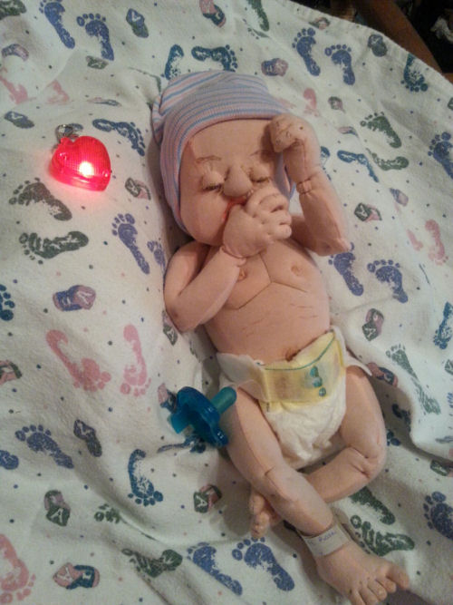 I made Gracie for a family member who's baby had to come early. I used Sandy Eding's Preemie Doll Pattern for a 32 week preemie. Her body is weighted 3lbs 12oz. and is 14 1/5 in. long. Her hands are wired so they can be posed. She has finger nails and toe nails. Her mouth is open and can take a pacifier or her own thumb. She also has a flashing heart. Completely hand sculpted from head to toes.
