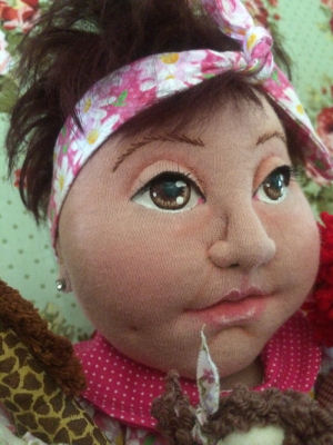 Look at Snuggles and you'll see she has a sculpted tummy and chest. Her back is sculpted in the same manner. The little upturned nose and pointed baby chin are pompoms tucked under the skin. Even the mouth has been sculpted into a shy little smile. The adorable little head is topped off with a doll wig.