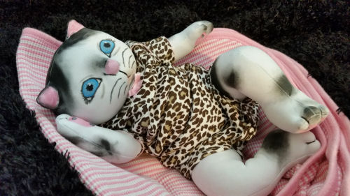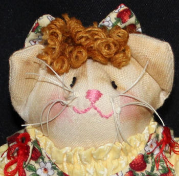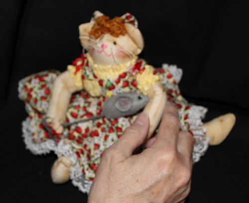 She is a restyled pattern by A Stitch in Pine. I made this Kat many years ago but this time I reduced her size to 40% of the original pattern and added a few of my own ideas to her. She is carrying her favorite mouse. There is a lot of sculpting in this Kitty, and being so much smaller it was a challenge at the time but was also fun to see her come to life. I wanted a smaller shelf sitter and I thought she would be perfect for this.