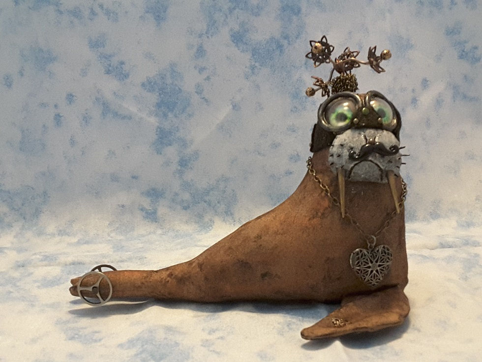 Oscar is wearing his most treasured steampunk attire. The heart shows that he is looking for a lady walrus of similar inclinations.