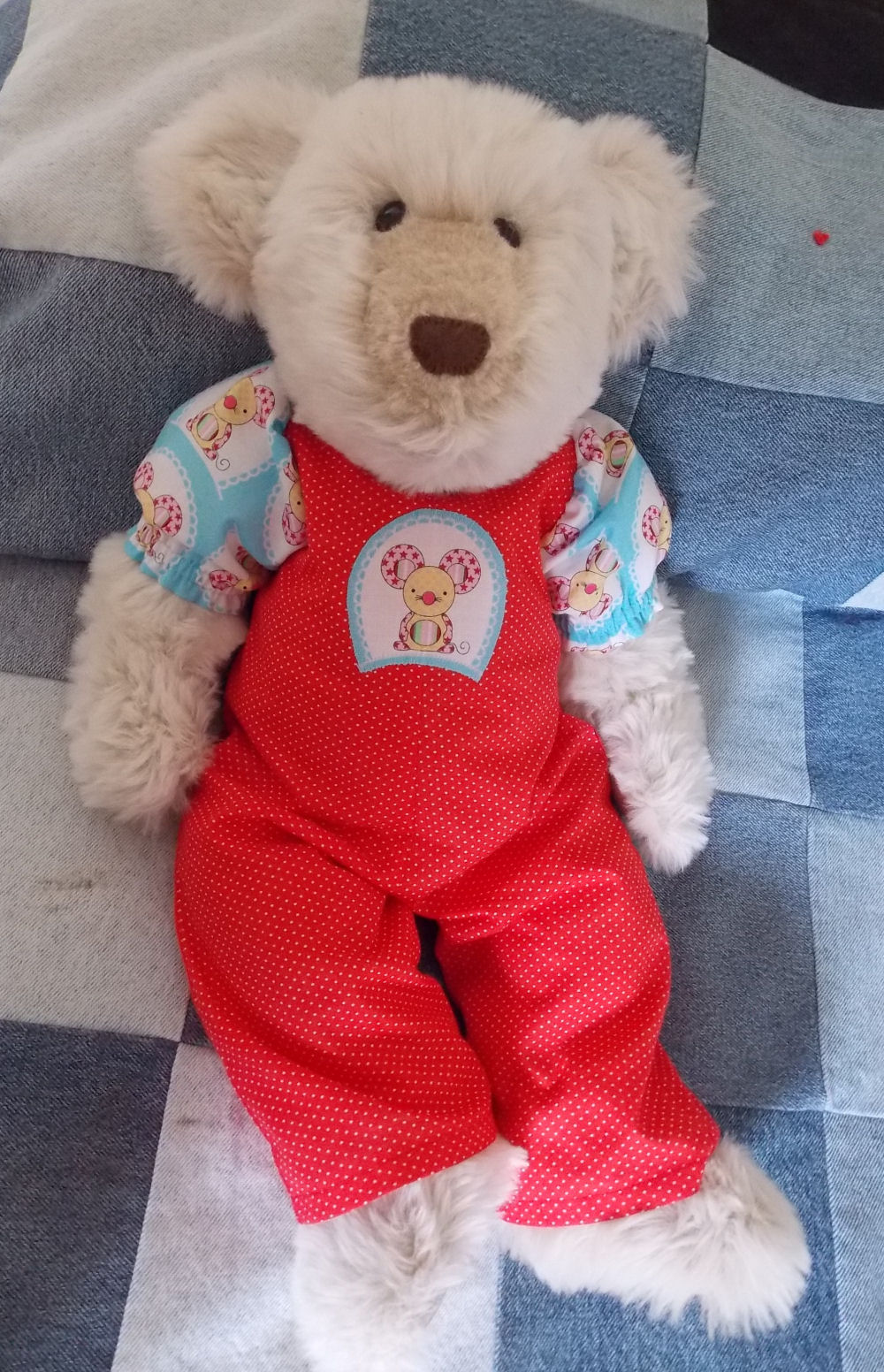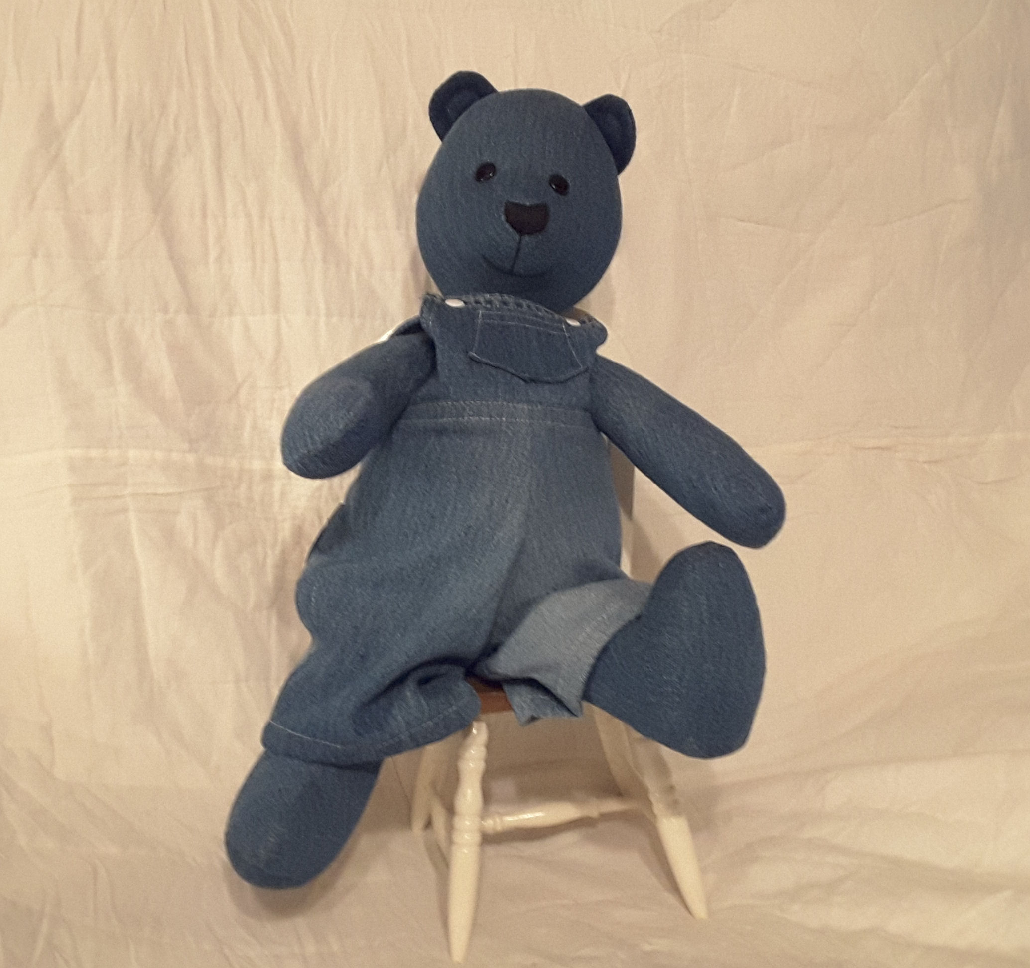 The overalls that the bear is wearing were made using my own pattern and using the fabric from the same overalls.