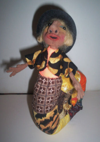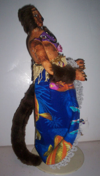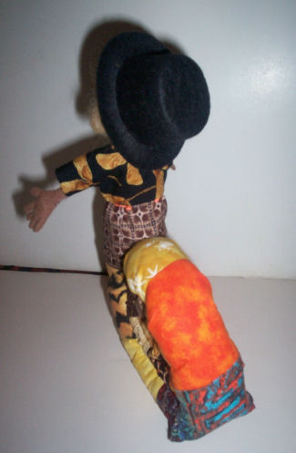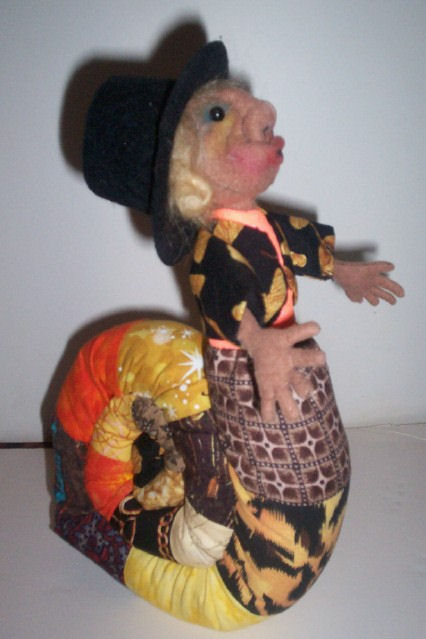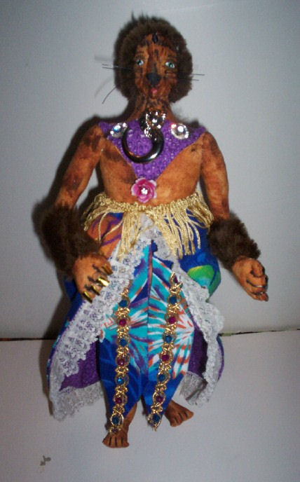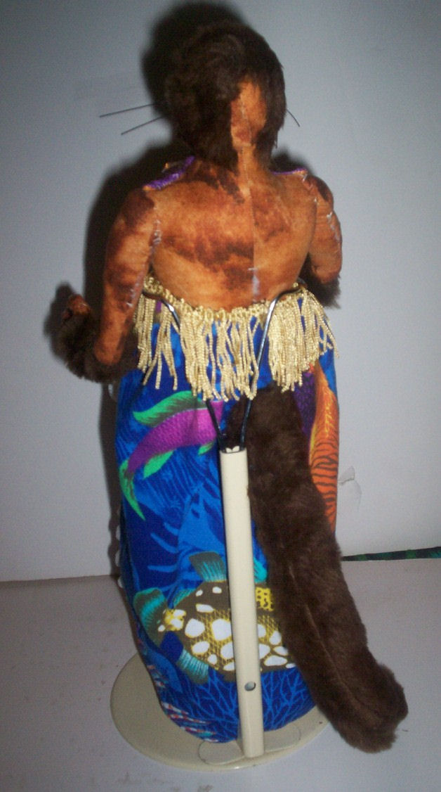 I'm made of a mottled kind of fabric,, and some fake fur, paint, and all kinds of embellishment.. I do stand alone.. but I"m still a little clumsy.. so my standy helps me.