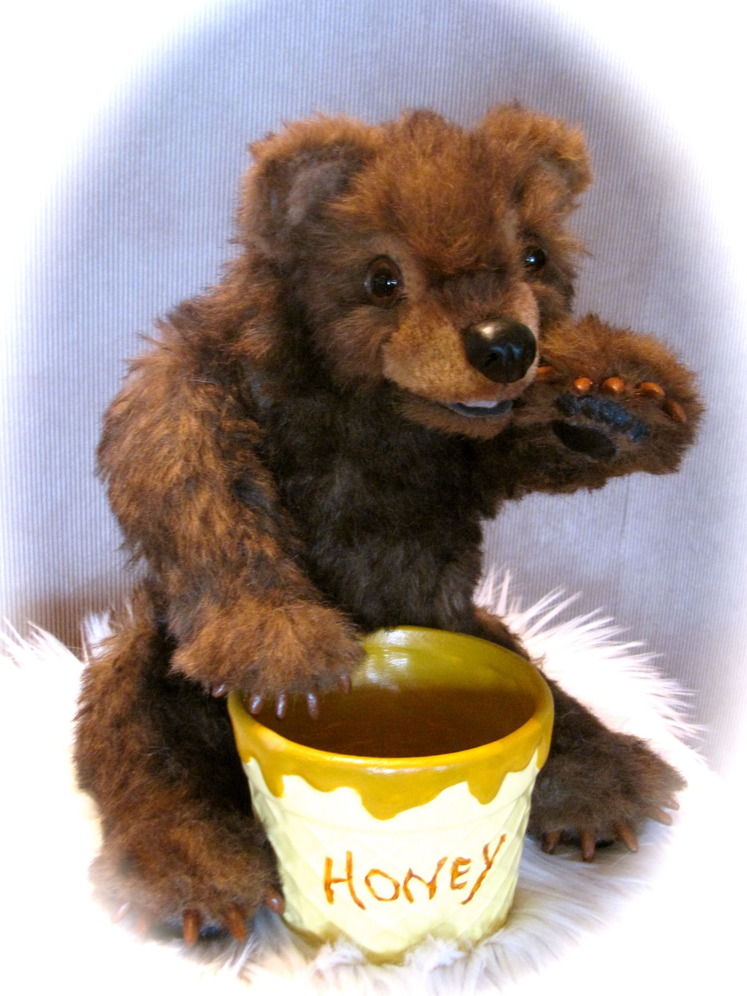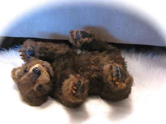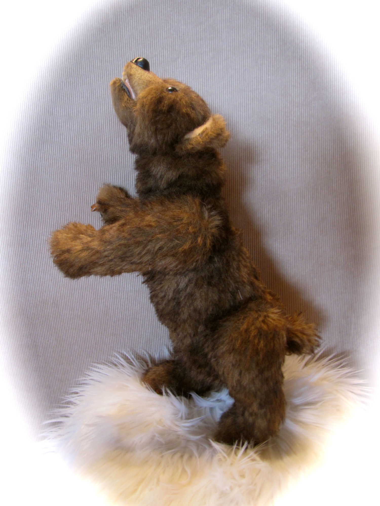 This little Guy is made from a pattern by Furry Critters I have altered it a little bit by adding claws and felting around the eyes and inner ears. It is made with Alpaca and has a loc line armature and also jointed the nose and claws I made with Apoxie putty and the paws and eyelids are leather and you can open or close the mouth.