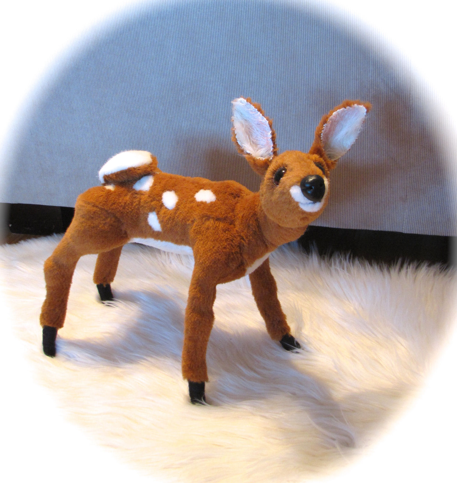 I made the Fawn from a pattern by Furry Critters it is made from Alpaca and has a loc line armature and a sculpted nose glass eyes and leather eyelids with eyelashes.
