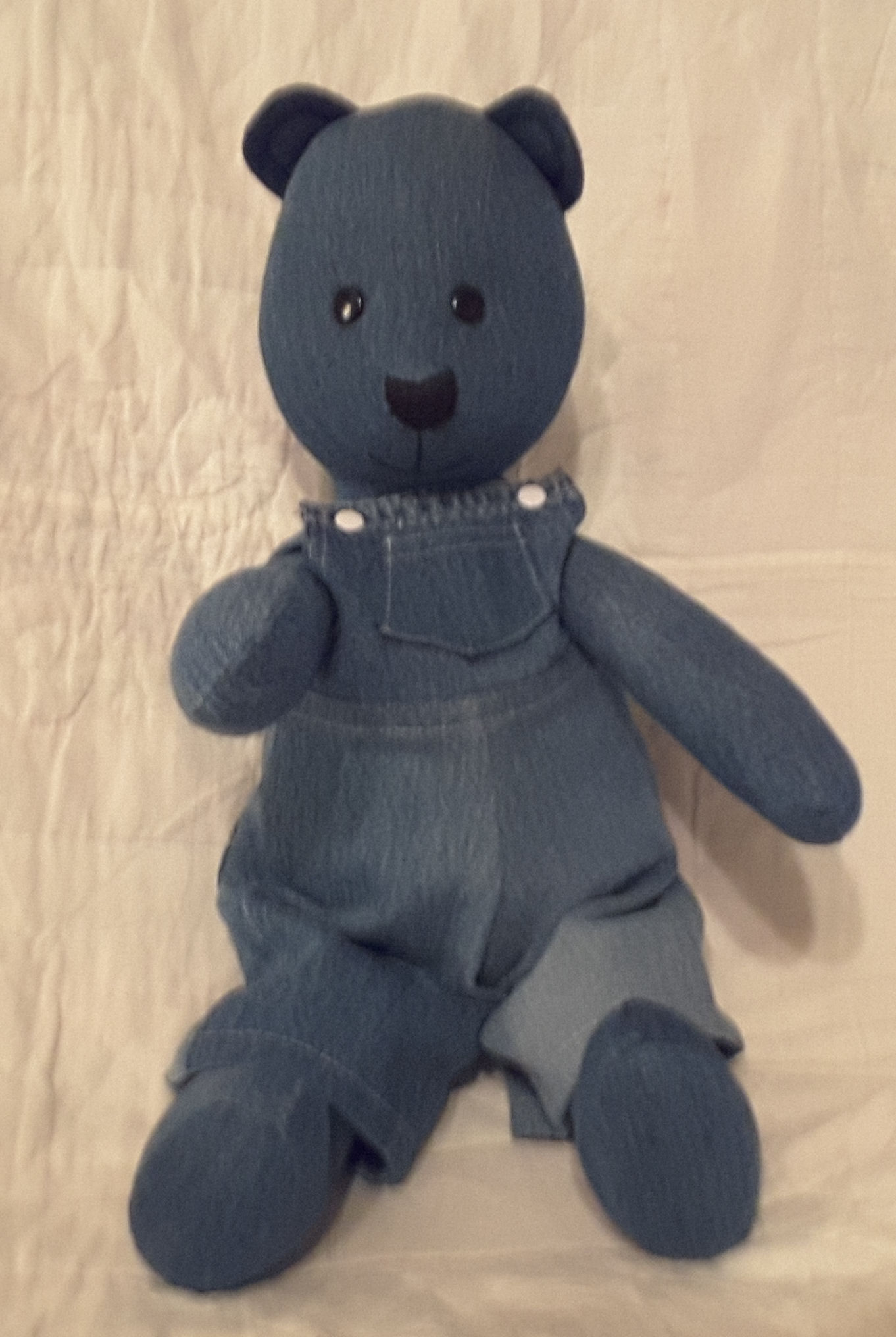 What is special about this bear is that it was made for my husband's 70th birthday and it was made using overalls that belonged to his dad!